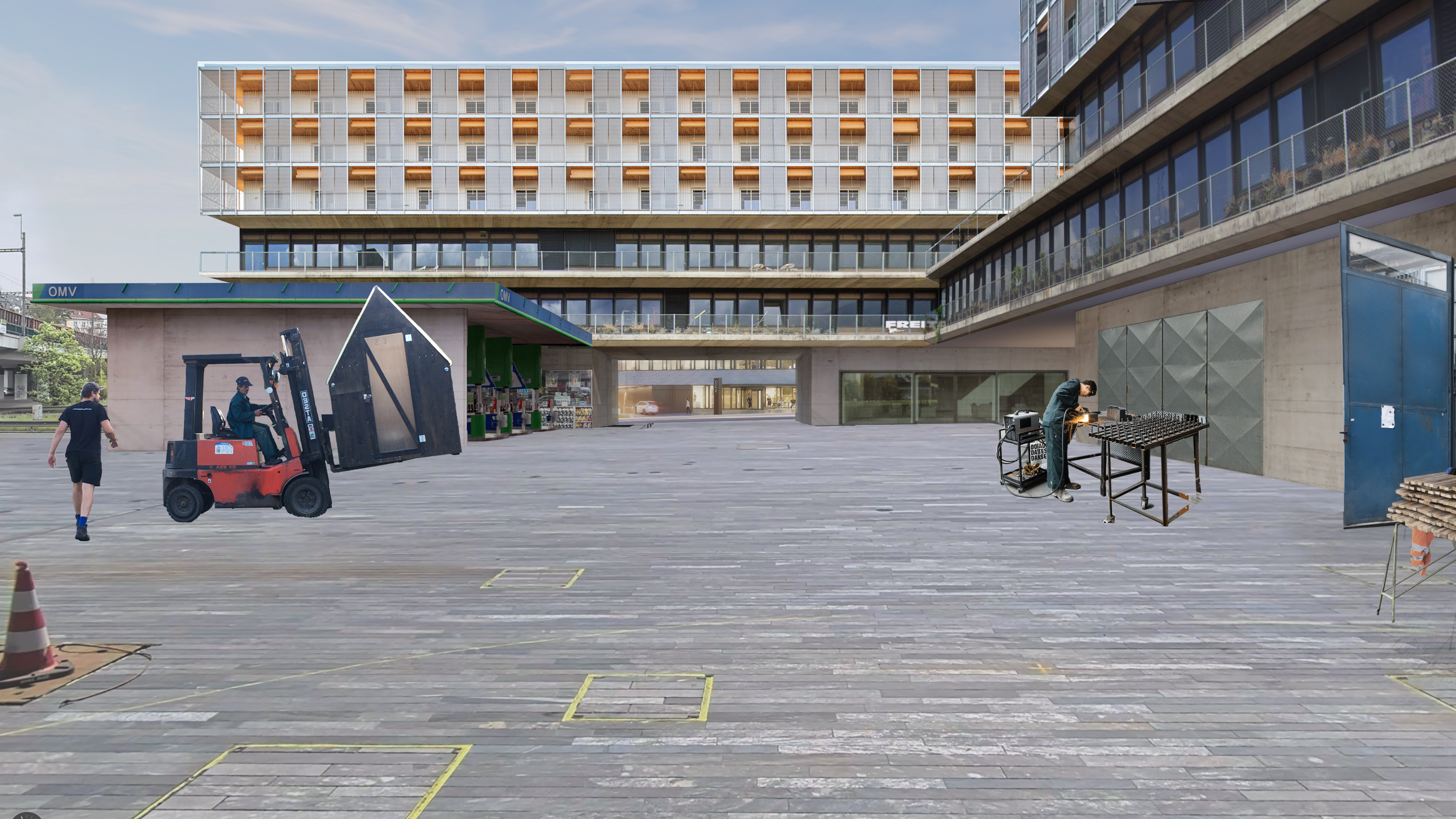Josef Kučera navrhuje městský dům, či spíše areál u paty mostu Barikádníků na okraji Holešovic. Základním principem projektu, který řeší složitou okrajovou parcelu, je polyfunkčnost v podobě dílenského provozu, bydlení, office a čerpací stanice v parteru jednoho z objektů. Ostrov na okraji městské struktury, odříznutý od města dopravní infrastrukturou a lemovaný Vltavou. Celý komplex je navržen jako svébytný celek, vnitřně provázaný pracovní ulicí, která spojuje všechny provozy návrhu. Jednotlivými objekty reaguje jak na velmi rušnou komunikaci, tak na železniční most i park na okraji řeky. Celý soubor staveb autor navrhuje v předem daném rastru, díky kterému je jednak zajištěna ekonomičnost návrhu postavená na možné prefabrikaci, a zároveň sceluje jednotlivé funkce v logický a flexibilní systém.